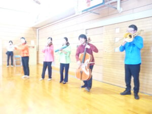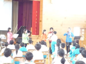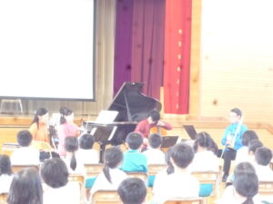 ヴァイオリン、チェロ、フルート、トロンボーン、ピアノによる演奏は、どの曲も心に響き、子供たちも引き込まれていました。