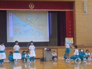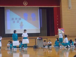 16日(木)は、朝活動の時間に「フレンド集会」を行いました。今回の集会では、4年生が第1学期にSDGsについて学習し、自分でも取り組める活動を見付け、夏休みにチャレンジしたことを一人一人が絵を描き、感想と共に紹介しました。