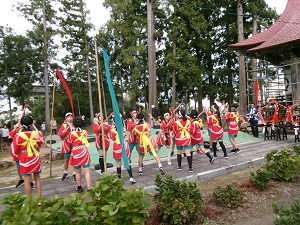 心地よい秋風が吹く中、参加した5・6年生児童は「刈り込み祝い唄」と「小天狗の舞」を披露しました。