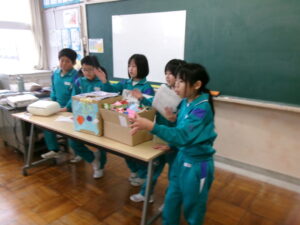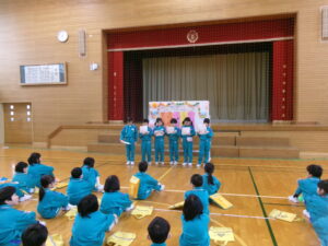 3年生が集会の企画や進行をし、1・2年生に楽しんでもらえる集会にするために、今日25日まで準備を進めてきました。ゲームタイムでは、班のみんなと楽しく活動する1・2年生の姿や、下級生に優しく声をかける3年生の姿が見られました。たくさんの笑顔が溢れる集会になり、これからも仲よく学校生活を送ってほしいと思います。