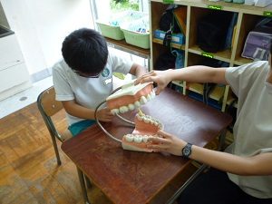 今日は、1年生が養護教諭と一緒に「歯の王様」(6歳臼歯)について学習しました。6歳臼歯は、6歳頃に奥に生えてくる大人の歯で、とても大切な歯だという話を聞きました。その後、6歳臼歯の磨き方を模型を使って練習しました。子供たちは、「見えにくい」「難しい」と言いながらも、歯の表、裏、かみ合わせ、後ろを丁寧に磨いていました。